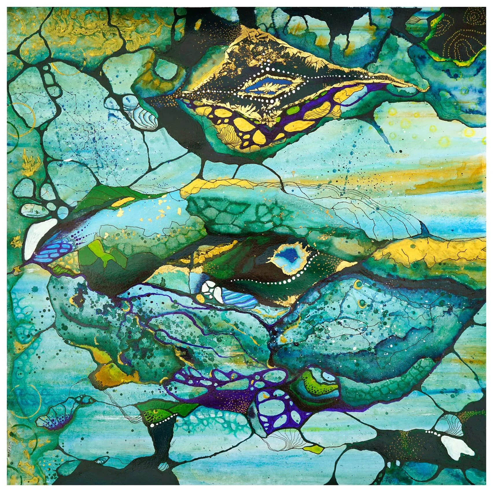 I work on paper and canvas using a variety of paint mediums and natural ground earth materials to create texture and depth to my work.
